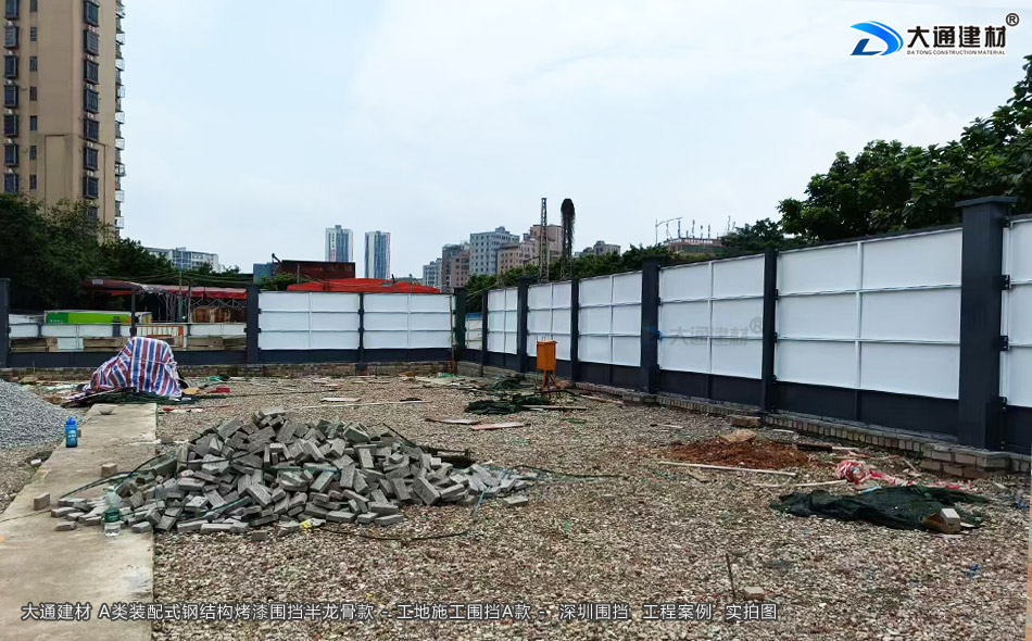 深圳大通建材A類裝配式鋼結構烤漆圍擋,主要由型鋼、方管、鋼板等鋼材構建框架,搭配鋼板等面板組成,即采用裝配式設計的特點,方便根據場地實際需求進行靈活組裝與拆卸,能多次重復使用,有效降低了工程成本,符合可持續發展的理念。
