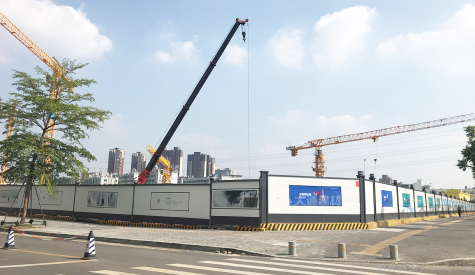 深圳市大通建材裝配式鋼結構圍擋A型可以進行快速拼裝,深圳寶安國際藝展中心工地施工項目在安裝好施工圍擋后,施工單位開始進行各種施工,最大可能的保障第三方的安全。