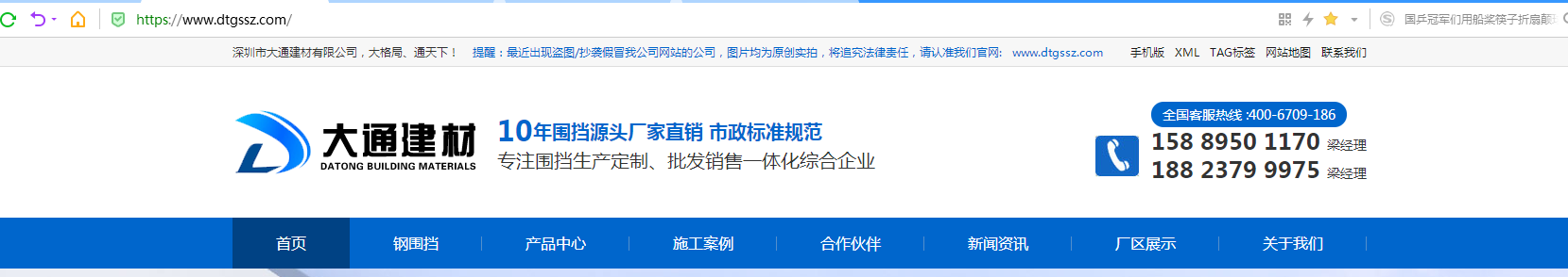 深圳市大通建材有限公司是一家集研發、生產、安裝、服務于一體的綜合性圍擋廠家, 公司主營產品鋼圍擋、鋼結構圍擋、PVC圍擋、工地圍擋、烤漆圍擋,官網:http://m.ddomelt.cn/ ,銷售熱線:138 2656 2448。
