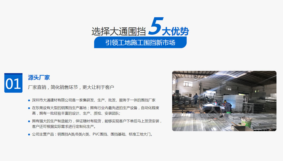 深圳市大通建材有限公司是一家集圍擋研發、圍擋生產、圍擋定制、圍擋批發、圍擋配送、圍擋安裝等服務于一體的綜合性圍擋生產型企業。