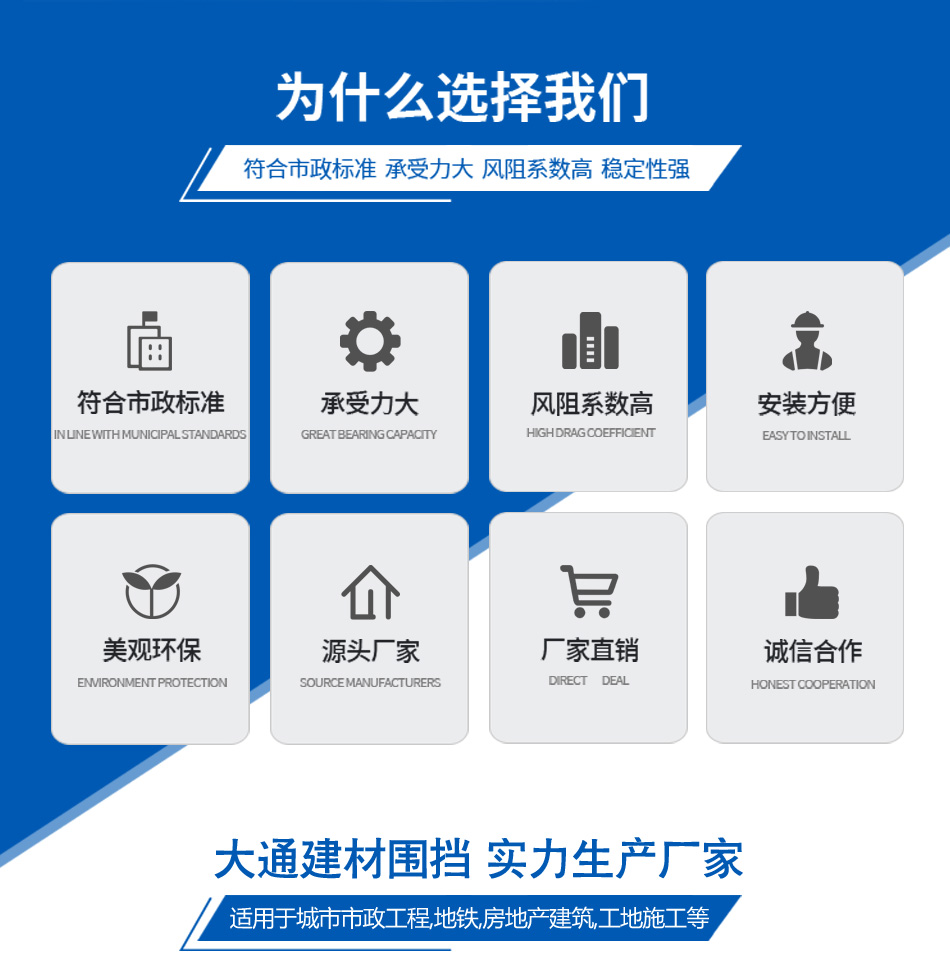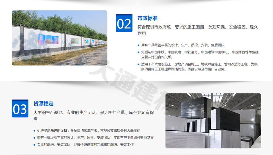 2019年,大通建材成為圍擋行業領先企業,大通圍擋安全穩固、美觀環保,適用于市政建設施工、房地產項目施工、隧道施工、地鐵項目施工、路橋維護施工、立面改造施工、廠房隔斷施工、管網改造等工程。
