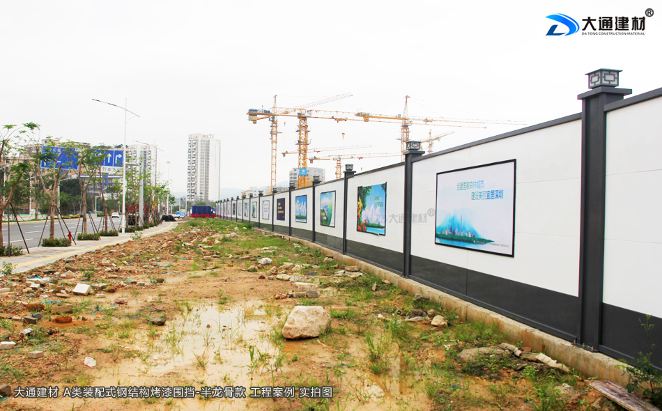 深圳市大通建材鋼結(jié)構(gòu)圍擋A,堅持深圳質(zhì)量,關(guān)注城市美學(xué),培育精益求精的工匠精神,結(jié)合深圳開放、創(chuàng)新、現(xiàn)代、濱海的城市的特征和公益宣傳的要求,提供具備不同區(qū)域環(huán)境特點的外觀設(shè)計方案,外觀顏色可以是白色+深灰色烤漆擋板、亦可是全白色烤漆擋板、美觀大氣的現(xiàn)代風(fēng)格; 再結(jié)合城市區(qū)域特點,分片區(qū)、分道路、分街景各自選用同類風(fēng)格圍擋,營造美觀、整潔的城市環(huán)境的同時實現(xiàn)圍擋風(fēng)格區(qū)域性的協(xié)調(diào)統(tǒng)一。
