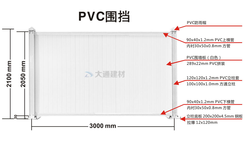 上圖展示的是大通白色PVC圍擋 規格參數圖