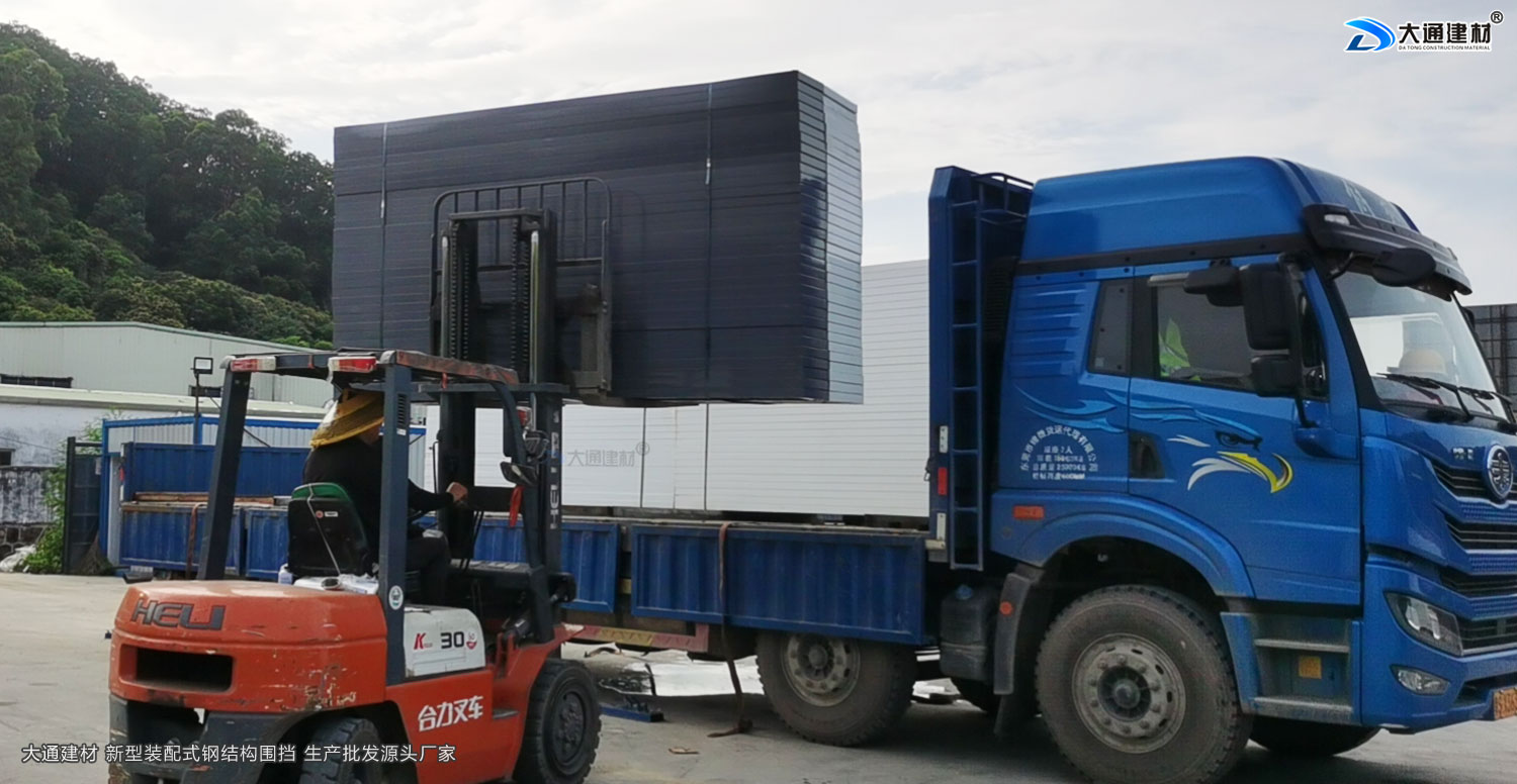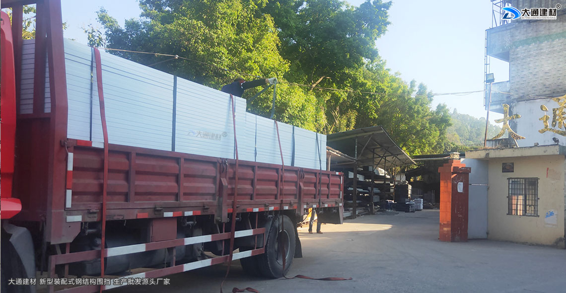 【圍擋入庫】是將生產完成的圍擋進行入庫,進入發貨狀態,在經過前面四種工藝材料切割、墻板折彎、立柱焊接、烤漆后,圍擋已幾乎完成,這時就需要將生產好的配件進行入庫存放,大通建材在生產產區旁新建了占地面面積約5000平米的發貨廠區,達到客戶下單即可安排發貨效率。