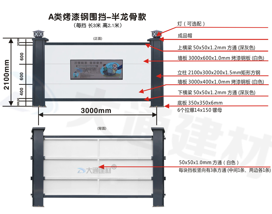 深圳市大通建材A類鋼圍擋烤漆半龍骨款的標準高度是2.5米、長度為6.3米一擋,而圍擋高度特殊需求的如2.1米/3米/4米/5米/6米等高度的可以進行定制化生產。