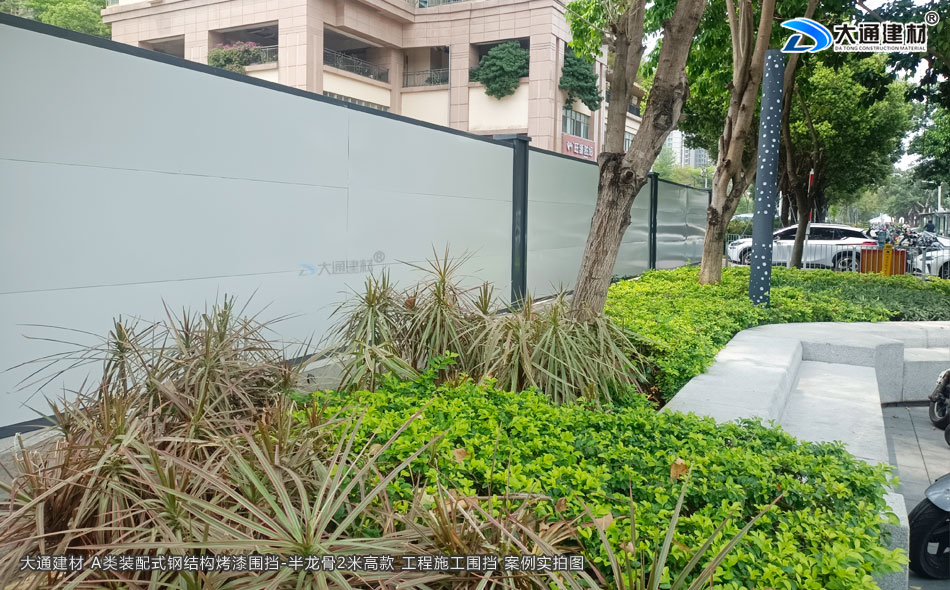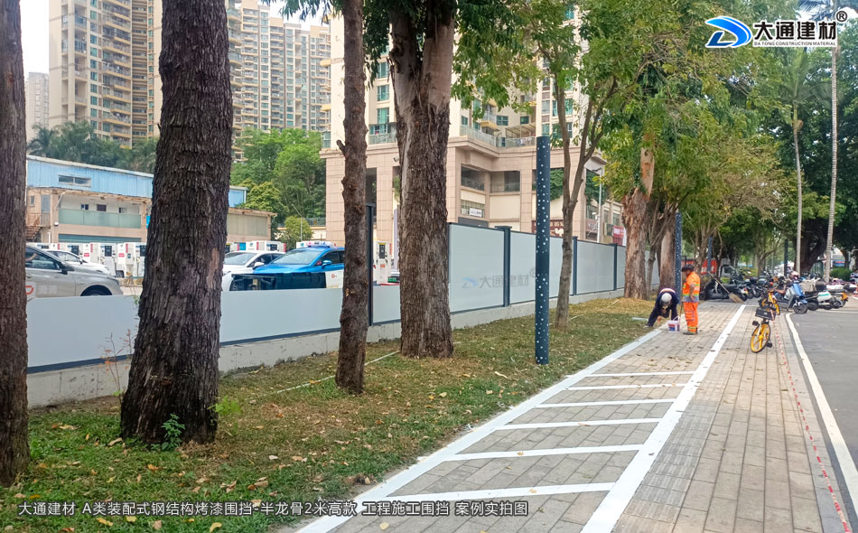 深圳大通建材生產的2米1高A類裝配式烤漆鋼圍擋半龍骨款 適用于各種項目工程:如市政工程建設施工、房地產項目建設施工、地鐵修建項目施工、管網改造、小區改造、城市建設、道路修建施工等工程修施工外圍使用
